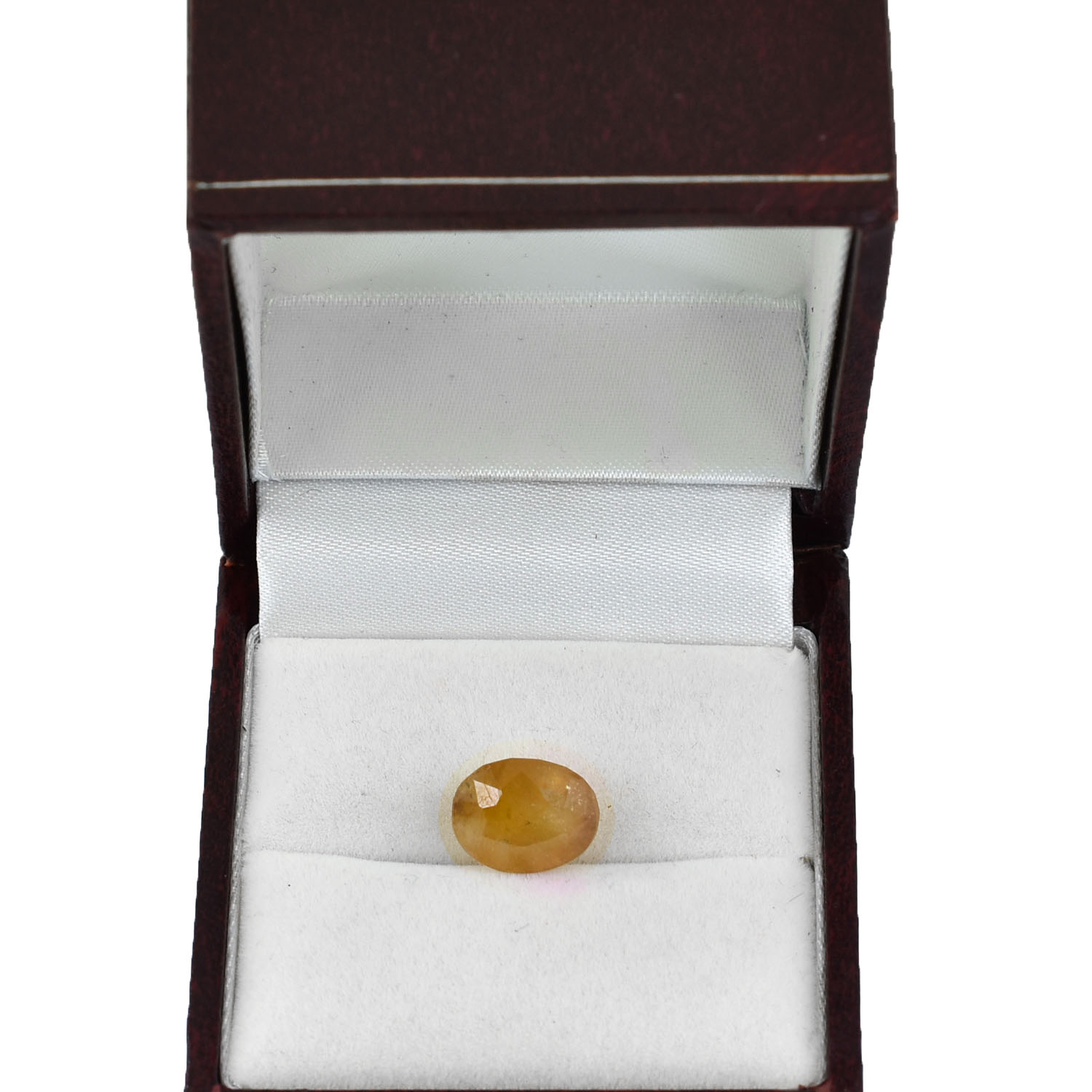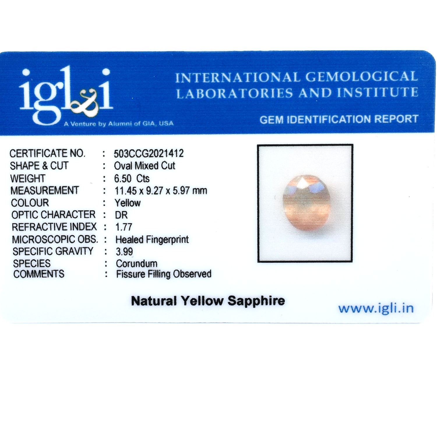 Add timeless elegance and radiant energy to your collection with this Natural Yellow Sapphire, weighing 6.50 carats. Expertly crafted in a Oval Mixed cut, this gemstone showcases exceptional clarity and brilliance, emphasizing its vibrant golden-yellow hue.